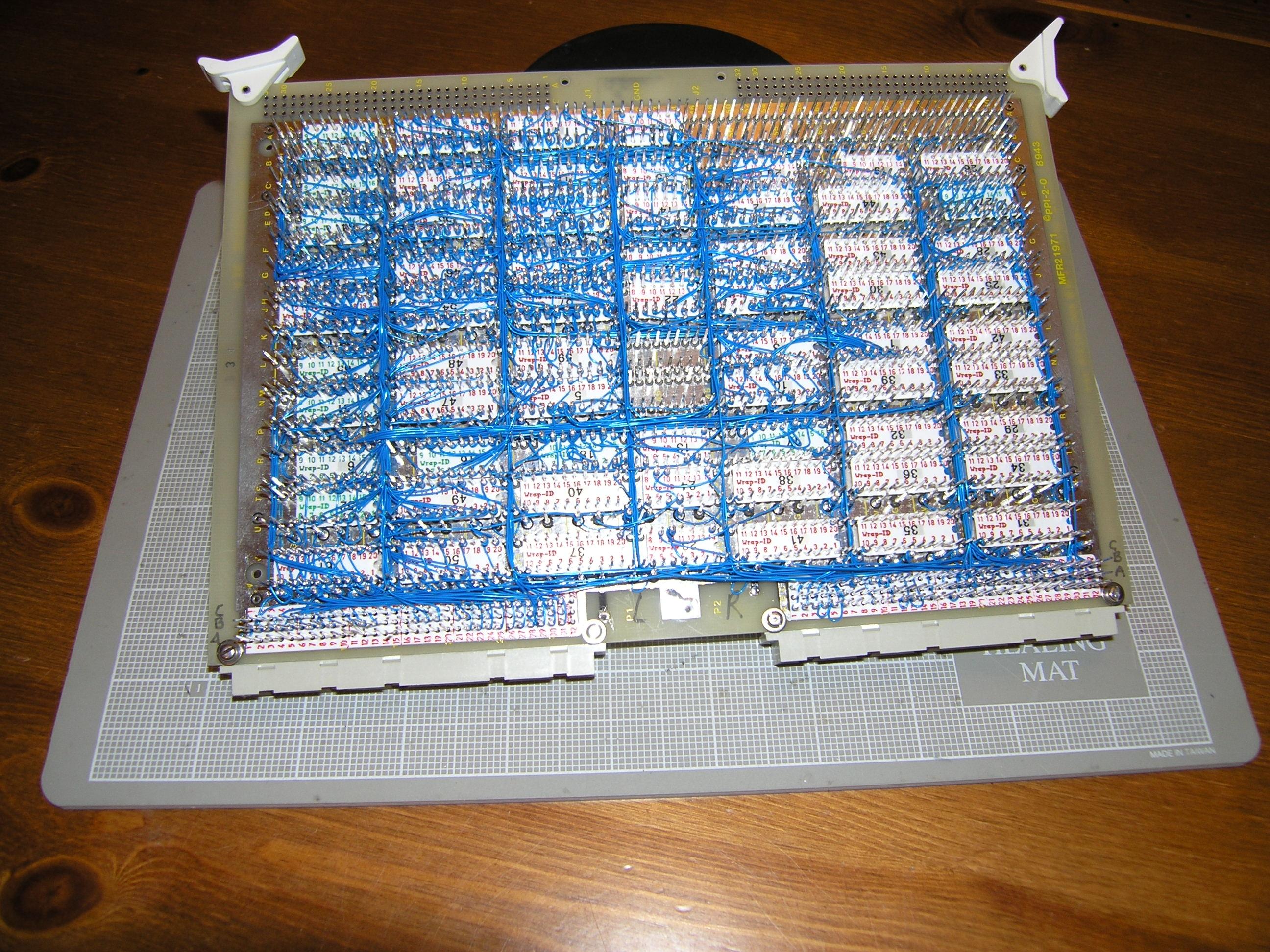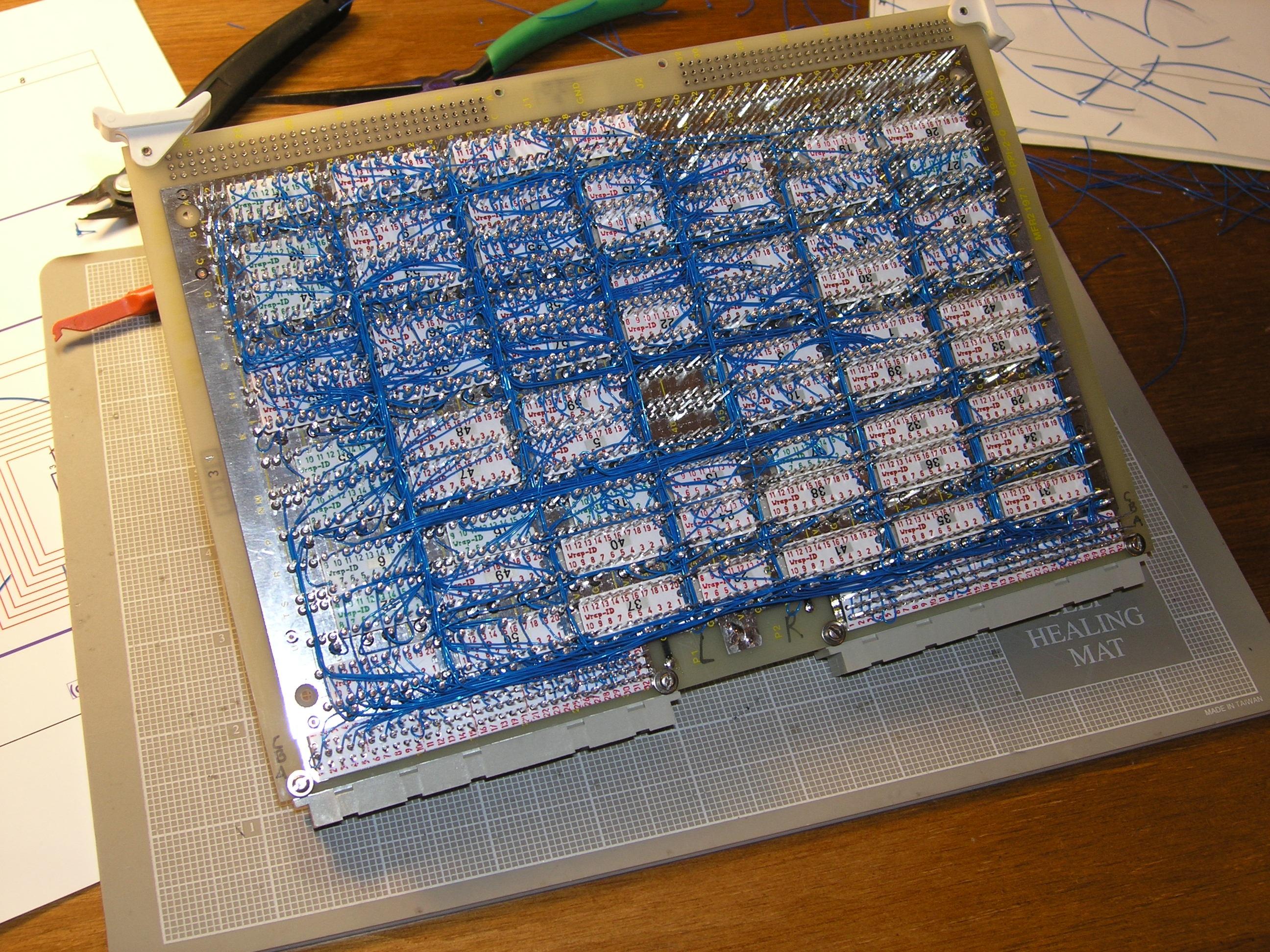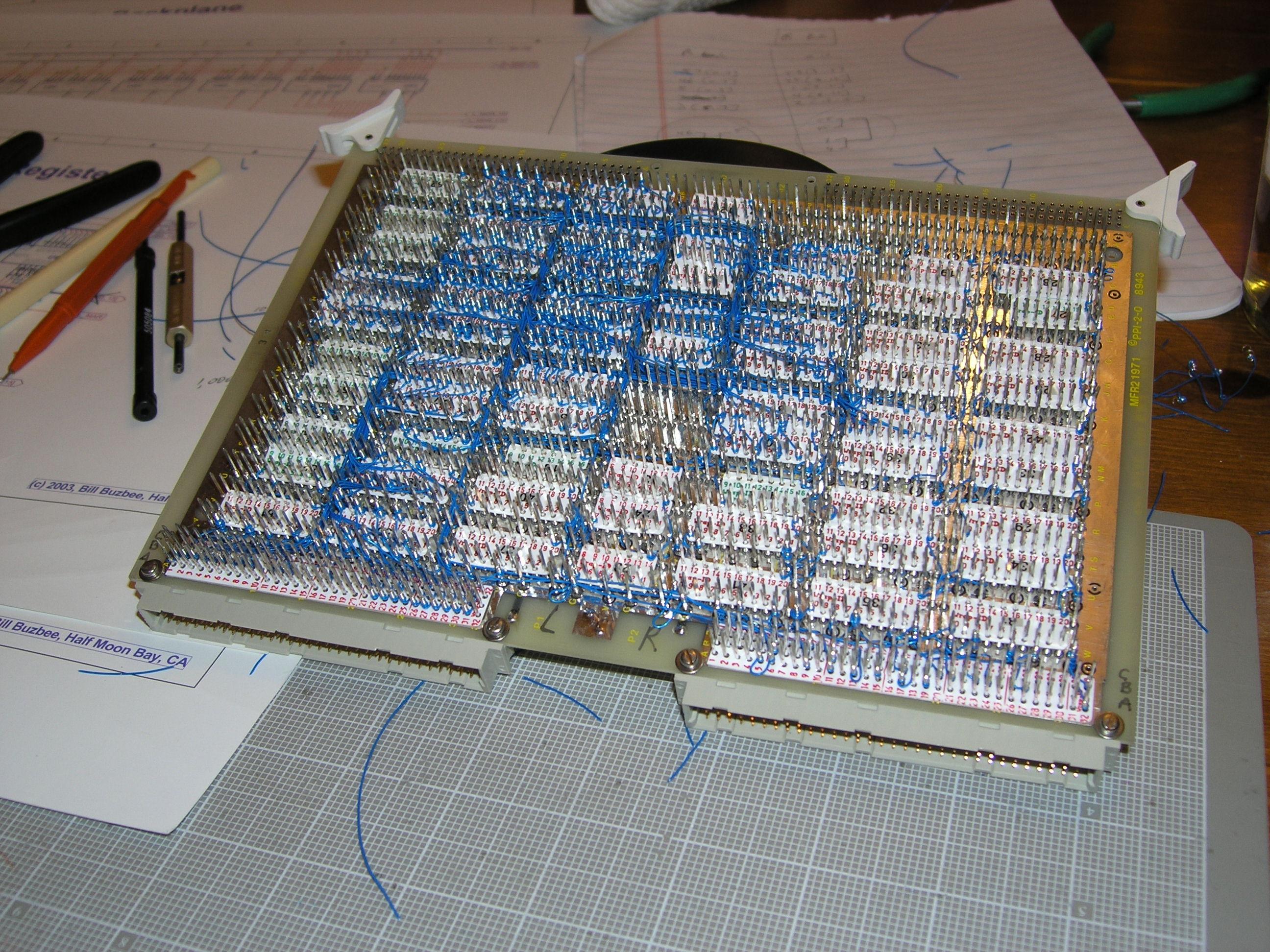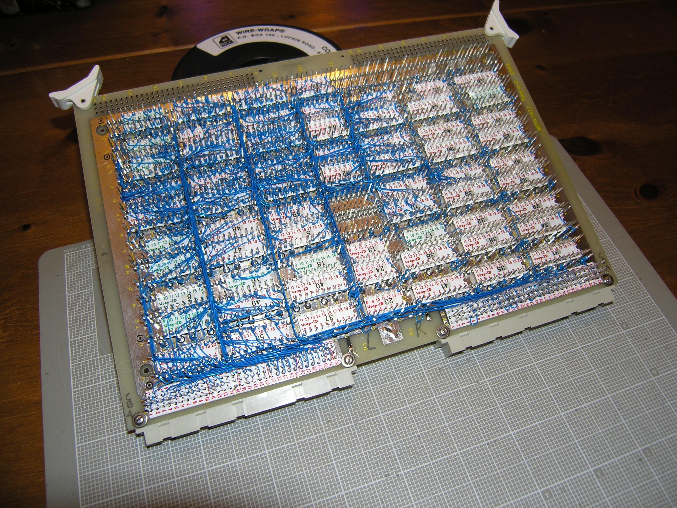 ALU/Register card construction [finished 4/12/2004]Before starting on the control card, I thought that it would be the most difficult to build. I think I was wrong. The ALU/Register card is going to be tough. It has the most devices than any other card, and almost all of the signals are bussed. This means that most pins will have two wraps on them. Wrapping the 2nd wire on a pin is significantly more error prone for me than doing the first one. 4/12/2004This was the toughest of the cards to build - but it's finally finished. Here's a shot of the populated component side: 4/10/2004With an increasing sense of excitment and fear, I spent the day finishing off this last card. First was a complete beeping out of the card, where I found found two wires that had broken since the first beep-out. Both were in very heavy traffic areas, covered by lots of late wires from the L and Z busses. I've been doing all of the repair wiring with a hand wrapper, in order to avoid adding any more pressure to tight spots. Then, I soldered in the bypass capacitors, burned the EPROMs with the real microcode and the boot ROM with the fibonacci function test program. This was going to be the moment of truth - first attempt to run with everything in place. All I needed to do was install the rest of the chips, power it up and see if all of my hard work of the last three or four years had paid off. Shit. I installed everything but the four 74153s. Couldn't find them. Searched my parts bins, looked everywhere. Damn. I must have left that line off of my order, and never bought them. Damn, damn, damn. Tommorow's Easter, so even if there were a parts place open tommorow (Fry's might have these), there's no way I'd be able to bail out on the family events to go chase them down. I'll have to wait until Monday night to see if this thing is going to fly. Shit. 4/8/2004Partially beeped out the card - all of the new wires since the previous partial beep-out (cheated a bit, though - just check the first and last pins in busses). I will do a full proper beep-out, but I succumbed to wishful thinking and decided to push for an alu test. The simplest thing would be to fetch an instruction and advance the program counter - so I populated just enough of the card to support that and gave it a whirl. No luck. Spent an hour debugging and finally discovered a miswiring in my backplane. I had beeped that out a year-and-a-half ago when I did it, but obviously missed something. So, I'll add that to my proper beep-out list and approach the bring-up the way I should - a little bit a a time. More details of my "feeling lucky?" bringup attempt in the diary. As far as the ALU/register card goes. I need to complete the beeping out, and solder in the bypass capacitors. This should happen over the weekend. I haven't yet attempted to repair the backplane either - will shoot for this weekend for that as well. 4/6/2004WooHoo! The card is wrapped! I still have to beep out everything again, and no doubt will find some mistakes. But damn, it's good to be basically done with wire wrapping. This card was brutal, but I'm glad I saved it for last. I'm a vastly improved wrapper now that I was four months ago. I think after this is over, I'll never want to see a wire-wrap gun again. Looking over the card, I'm generally pleased with my floorplan. There are only a couple of places where I had wire traffic jams. Overall, the wires are quite balanced. This is a result of good device placement. Could have been better, of course, but it worked out pretty well. Here's a picture: The red wires make it all look a bit sloppy. I'm probably being foolish, but my intent here was to isolate the edge-sensitive signal lines and run them outside of the normal wire channels to minimize cross-talk where it matters. Anyway, here's another angle: Besides the beeping out, I still need to enhance the temporary front panel assembly to support viewing register contents, and I've also got to solder in the bypass capacitors. While this is going on, I'll think about my bringup plan. So far, I'll probably start with populating the card with only the MAR and control bit flip-flops. That will enable me to make sure the rest of the machine still functions the way it did when I was using a dummy alu/register card (with some control bits wired low). After that, I'll probably go ahead and fully populate the board and just try a full-blown test of the fibonacci test program boot ROM using the real microcode. The liklihood that it will work first time is pretty low, but you gotta try. That will probably happen Friday or Saturday. 4/5/2004Hard for me to believe, but I'm approaching completion - there are just under 100 wires to go. The wrapping is slow, but I'm getting better at it. I've finished off the L buss, and if I continue to improve, I think I can completely finish the wiring on this board in my next wiring session (perhaps tommorow night). After that, I need to beep everything out, solder in the bypass capacitors and install the devices. At that point, the basic computer is complete and bring-up begins. If everything goes well, I could actually have M-1 running within a few days. Exciting stuff! Oh, I also plan on doing a bit of an enhancement to the temporary front panel. I'm going to add 4 HP hex displays and a rotary switch to enable display of all registers connected to the L bus. I'll also add a pair of HP hex displays to show the current opcode. This shouldn't take too long. I'll need to swap out three chips on the front panel logic board to make this work. My front panel design assumes LEDs, and the way I'm driving them I have negative logic on the front panel assembly. The HP displays want positive logic. Luckily, I buffer all signals going to the front panel, so all I need to do for this is to replace inverting bus drivers with straight-through ones, and visa-versa. Here's what it looks like tonight: 4/4/2004Best wrapping sessions ever - I breezed through all of the 1st level Z an