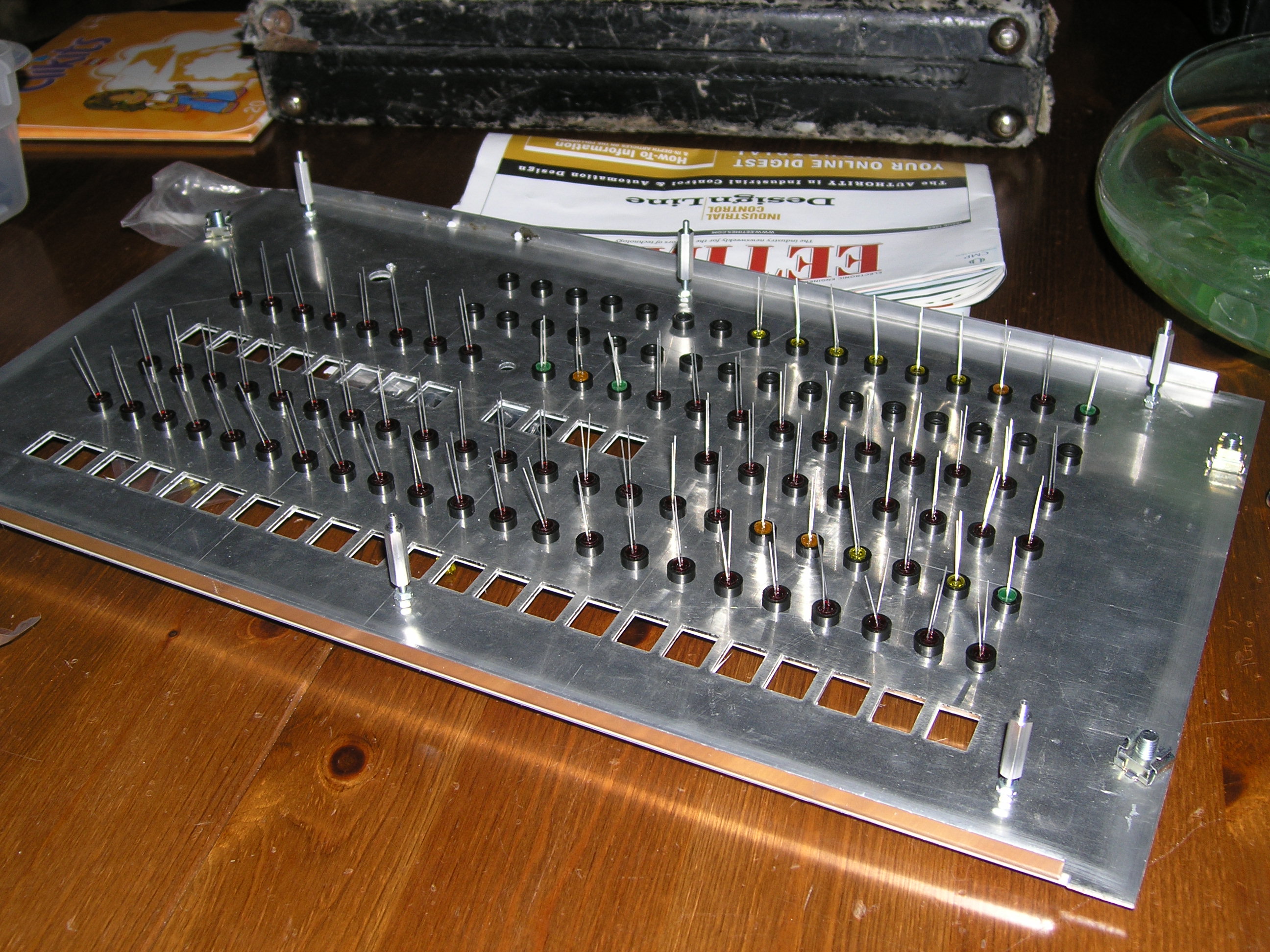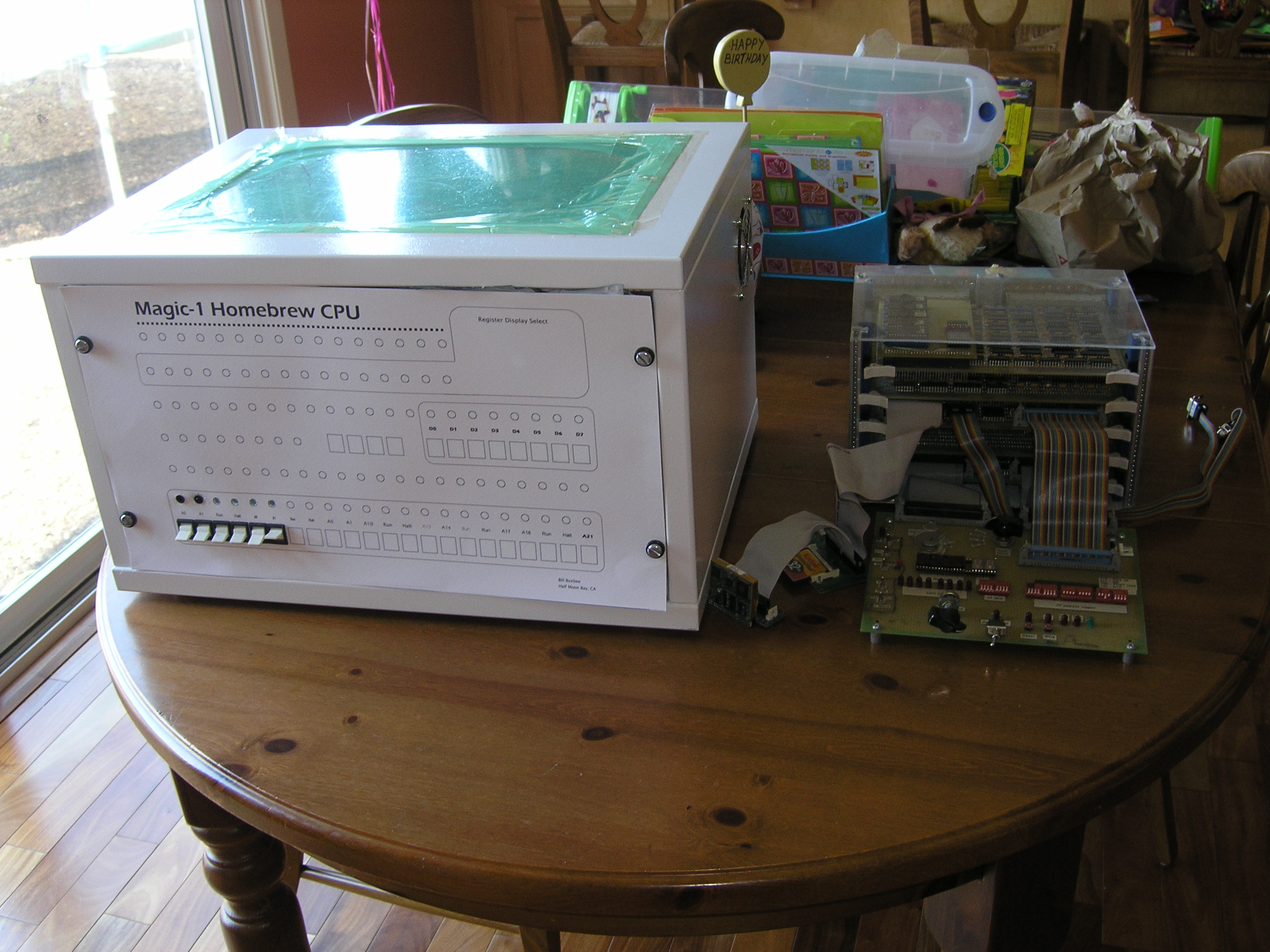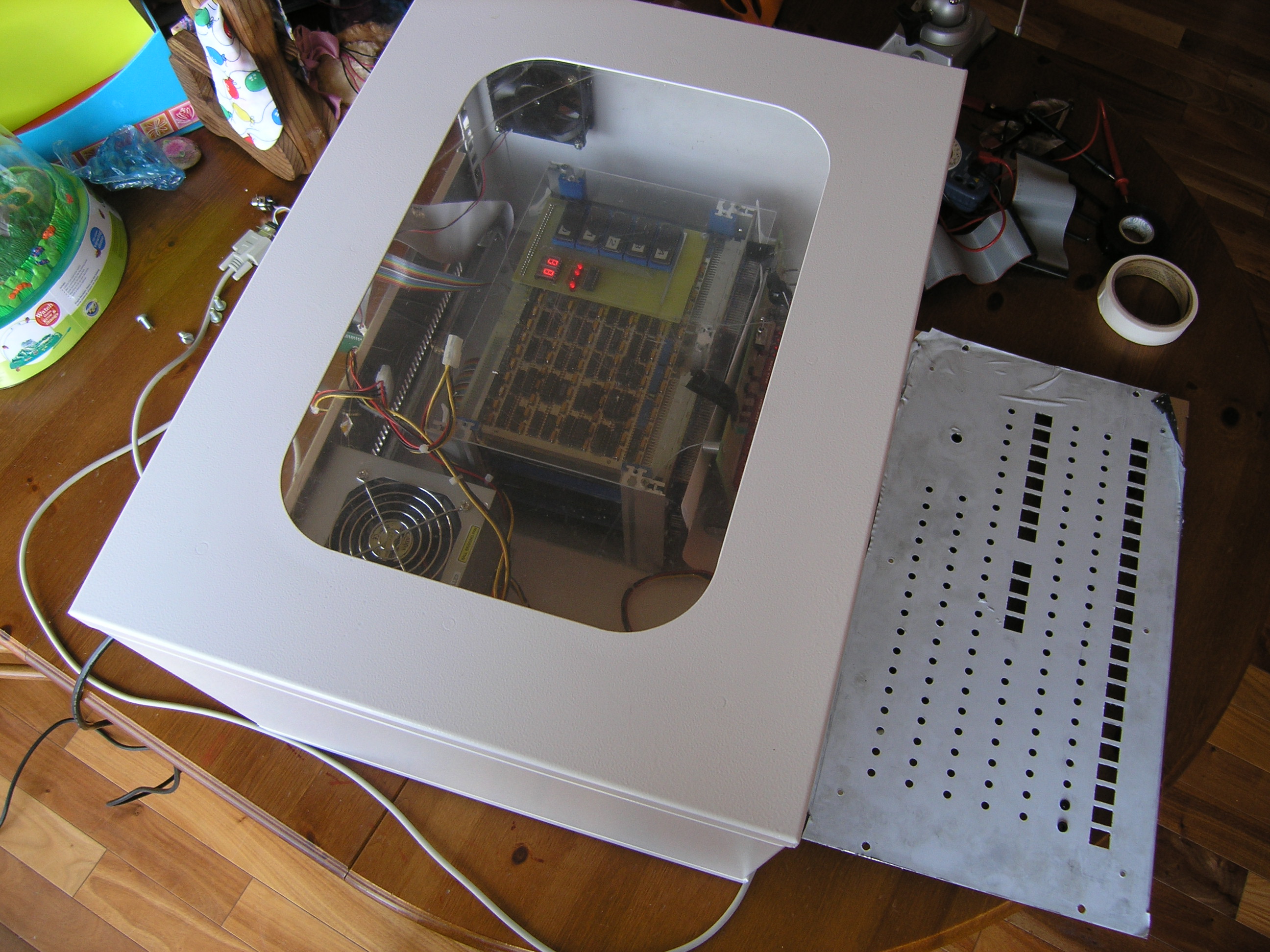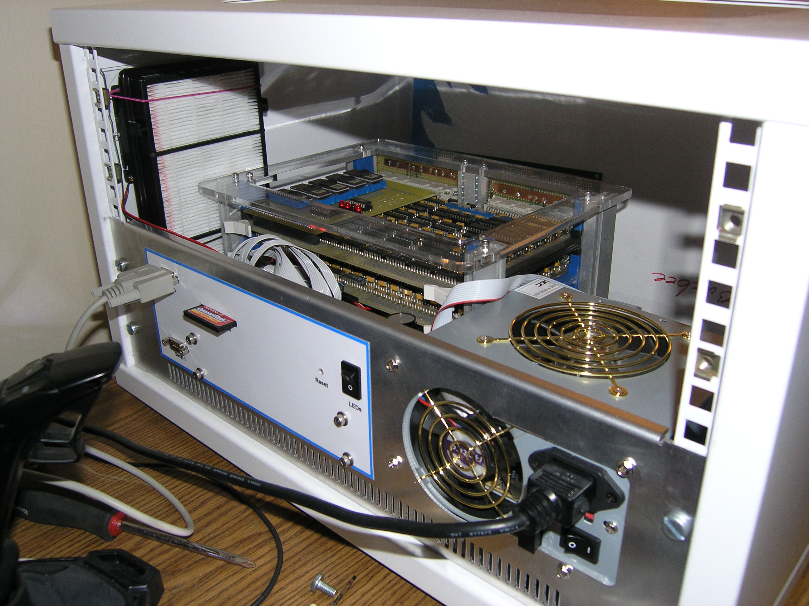 Front panel and enclosure construction [complete - 5/13/2005]5/13/2005It's done. Of course, I'm sure I'll find the occasional thing to tweak - and we're just talking about Magic-1's hardware. The software project ahead (particularly the Minix port) is going to take a lot of work and will probably take me a year or two. But still, I can say that Magic-1 is done. Hard to believe. I pretty much always have a hobby project or two working in the background, but Magic-1 has been a near (or maybe complete) obsession for the last four years. And, the damn thing really works - and works well. Anyway, enough of that. I've done a bit of tweaking since Mother's Day. First, Andrew Holme reminded me of the difficulties of doing pulldowns in TTL. I'm just going to let the IDE interrupt line float for now. When I get into the Minix port I'll enable that interrupt and the problem will go away. I spent some time working on the front panel LEDs. First, I decided to add a bit of color, and swapped out the interrupt enable, mode and paging enable LEDs with bi-color ones. So, for interrupt enable, green is enabled and red is disabled; for mode, green is user mode and red is supervisor mode and for paging green is paging enabled and red for paging disabled. I also did the same for the stop clock LED: green is running and red is stopped. The next thing I did was add an additional fan in the enclosure, with a power resistor to slow it down. The purpose of this fan is just to circulate air within the enclosure. Magic-1 wasn't getting hot by any means, but it was a little warmer than I thought ideal. With the second fan, you can barely detect any warmth on the boards (this is especially helped by the wire-wrap prototype boards themselves: the wire-wrap pins act as bunch of little heat sinks). After that, I started getting a little carried away. I added a fluorescent blue light bar to the inside top of the enclosure (along with a switch on the back panel to turn it on and off). It does nicely illuminate the inside of the enclosure, but I worry that it's the first step towards "pimping my ride." I'll resist the urge to add fuzzy dice and spinning rims. Finally, I noticed some problems with my LEDs. First, it appears that I was not paying attention when I bought my yellow LEDs from the surplus shop. They were not diffused, but rather were in a clear package. This caused them to be a bright point with poor field of view. I replaced them with diffused ones and they look much better. Secondly, with the large transparent window in the top of the case (as well as the case light), some of the lighter LEDs would appear to be illuminated because of the light coming from inside the case. To address this problem, I painted the back of every front panel LED with flat black paint. You can still see a little glow with the yellow LEDs, but in general the problem is solved. Not sure when I'll get the time, but soon I hope to reorganize this web site. I won't delete anything, but now that I'm no longer in design and construction mode it would make sense to have a summary page describing Magic-1, as well as some links to interesting pictures, text and movies (such as pointers to interesting diary entries, the video of the first successful Fibonacci run, etc). I've been adding junk to the site since 2001, and it's gotten pretty large and sprawling (and currently consumes 300 MB of storage. 5/8/2005Didn't do too much today (what with it being Mother's Day and all). However, since I did have the video camera out I went ahead and shot a quick video of Magic-1 running and uploaded it to the web site. As with most of my photography, it's of extremely poor quality. I'll try again later with better lighting. While doing the video, I noticed that IRQ1 was constantly being asserted. This is the interrupt request line that I've allocated to the IDE interface. I was a bit puzzled about what was going on there, as I am currently running with IDE interrupts disabled (using busy-wait loops for IO). A quick scan of the ATA spec, however, showed up a defect in my implementation. When IDE interrupts are disabled, the interface puts the IRQ line into a high-impendence state. I'm running it through an inverter, which would see this high-impedance state as an unconnected input. Since this is TTL, unconnected inputs tend to float to a HIGH logic state, which the inverter flips into Magic-1's low-active IRQ1. Just for kicks, I enabled IDE interrupts and they seemed to work fine (and the stuck IRQ1 disappeared). So, it looks like I need a pulldown resistor on that pin. Interestingly, I then referred back to Peter Faasse's 8255 IDE interface documentation (which I based Magic-1's interface on), and he does in fact have a 10K Ohm pulldown on this pin. Guess I just missed that earlier. Back to the enclosure and front panel, what I thought was a problem with POST code display was in fact pilot error. The POST code display works just fine. To add extra blinkiness, I modified the heartbeat interrupt code to increment the POST display once a second once we got past boot. I can't yet call the front panel and enclosure work complete. Still to go is bolting the card cage down. My issue here is that if I bolt it directly to the bottom of the enclosure, I won't be able to remove the lowest card. I have some thick nylon risers which would raise it up enough, but I'm pondering whether I should just go ahead and bolt it to the bottom. The reason is that even with the risers, it is quite difficult to remove the cards. I'm thinking about maybe just using an easily removed bolt or two on the assumption that I won't be pulling cards very often, and when I do I'll probably want to pull the cage anyway to get enough room to attach debugging probes. 5/7/2005We have blinky lights - and they look great. I completed the front panel wiring and after fixing a few mistakes Magic-1 fired up all bright and blinky: I hope to take a video of it running and post it within the next couple o