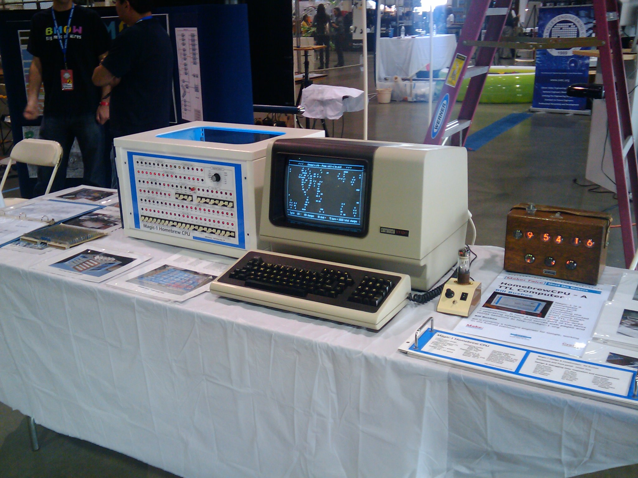 A lot of the people who stopped to talk about Magic-1 told me of their early computing experiences, and the machines they worked on or built back in the 70's and 80's. Several of them I recognized as active participants of the old Homebrew Computer Club from which Apple Computer arose. That was pretty cool.... Thanks to everyone who dropped by, and to Ken Sumrall - who took over my table several times each day to give me a break. 5/16/2007I've pulled Magic-1 offline to clean it up and get everything ready for this weekend's Maker Faire. Ken Sumrall lent me an old HP green-screen terminal, and it looks really good. I'm always a little nervous whenever I move the machine or pull cards, but it seemed to survive the move to the kitchen table and a good cleaning just fine. While I had things apart, I put in what I expect to be the oscillators for the final clock values - 3.67 Mhz and 4.09 Mhz. I had been running at 4.2 Mhz, but noticed some occasional I/O errors. 4.09 is fast enough. I'll use the 3.67 as a conservative fallback in case I start suspecting problems at 4.09. I'm not sure what the Maker Faire is going to be like, but it sounds like fun. Maia is excited about going - not to see her nerdy father, or course - but it looks like there are going to be a lot of craft activities for her. Anyway, besides taking Magic-1, I think I'll also bring the original memory card to show an example of wire-wrap. For that matter, I should also bring the wire-wrap gun, wire, a pile of chips, etc. in case anyone is interested in how it all went together. Also, might as well bring my combo Nixie tube/Dekatron tube clock (probably better stop there - too much stuff already). 5/1/2007Because I'm not going to be able to get the Minix port finished in time for the Maker Faire, I decided I needed to do something new for Magic-1 to show off. So, I've been working on getting the curses and termcap libraries from Minix ported over to my hack OS. Along the way I've had to add some new system calls, but it's starting to look pretty good. I've replaced the old 2-D Tic-Tac-Toe game with one that uses curses to draw the game board on the screen rather than just scroll (curses & termcap enable programs to directly place the cursor on the screen at x,y coordinates on a terminal screen). Right now I'm assuming that the telnet window used to access Magic-1 supports xterm cursor control codes. I've still got some bugs to work out, though. Tic-Tac-Toe works fine, but I'm having some problems with a curses version of Conway's Life program. This should open up a new set of game porting possibilities, and perhaps I'll even try the port of the vi clone. 4/24/2007It looks like my internet connection problems are finally over. A couple of weeks ago I started noticing hangs of Magic-1's web server. It was strange - other programs worked just fine and I could ping the machine. I went through my standard diagnostic actions (reboot, run verification tests, reseat all the chips, etc.), but found no obvious problem. Anyway, to make a long story short, it turns out that my DSL modem was failing. I'm running with a borrowed one right now, and everything is working again. This cost me enough time, though, that I probably won't be able to complete the Minix port in time for the Maker Faire. I'll see how far I can get. I'll record my progress over on the Minix Port page. 4/18/2007I've taken a bit of a break with this project lately, but hope to restart the Minix port soon. Magic-1 is set to be on display at the Maker Faire on May 19-20 at the San Mateo, CA fairgrounds. Details here. I had hoped to complete the Minix port in time for this event, but I doubt that will happen - I've been much too busy at home and work, and am having difficulty finding time for my projects. Overall, Magic-1 seems to be running pretty well. A few months ago I finally got around to seeing just how far i could push the clock. I ordered some custom oscillators from Digikey at 4.1 Mhz, 4.2Mhz, 4.3 Mhz and 4.4 Mhz. The verdict: Magic-1 runs at 4.2 Mhz, but not at 4.3 Mhz. So, since January I've been running Magic-1 at 4.2 Mhz. That's going to be the final top speed. As far as stability goes, I have been having some difficulty lately with the web server. I'm not yet sure, though, that it's a Magic-1 problem or just a home networking problem. I had one case in which I believed that Magic-1 was broken, but later discovered that my problems went away after cycling power on my router. Not helping matters has been my home DSL service - which has been very poor lately. The latest theory from the phone company is that my house is just a little too far away from the switch to support the speeds I'm trying to get, so we're going to try downgrading my service to see if that clears up the problem. For the Minix port effort, I have spent a little time cleaning up my development environment. I'm doing the work using a Linux virtual machine on my Windows XP host laptop. Previously I was using Fedora Core 5 with a Parallels Virtual Machine. I've now rolled to Ubuntu 7.04 under VMWare Workstation. Both worked, but VMWare has some especially nice features. In particular, cursor handling and the ability to generate images that can be played using their free VMPlayer. Finally, I decided to write a Magic-1 functional simulator for the Minix port effort. The time I spend writing it will be quickly made up during the port. It will be much easier to debug Minix on Magic-1 in simulation than on the real hardware. 11/8/2006The big news on the Magic-1 front comes from Aidil Jazmi of Universiti Teknologi Petronas. As part of his final year project, Aidil built a fantastic working clone of Magic-1. This is a really impressive accomplishment. it's tough enough for me to understand my own incomplete documentation, but Aidil was able to fill in the gaps. Not only does it work, but it also looks really fantastic. Aidil built a clear enclosure that really shows off his work. Fantastic stuff, and it 